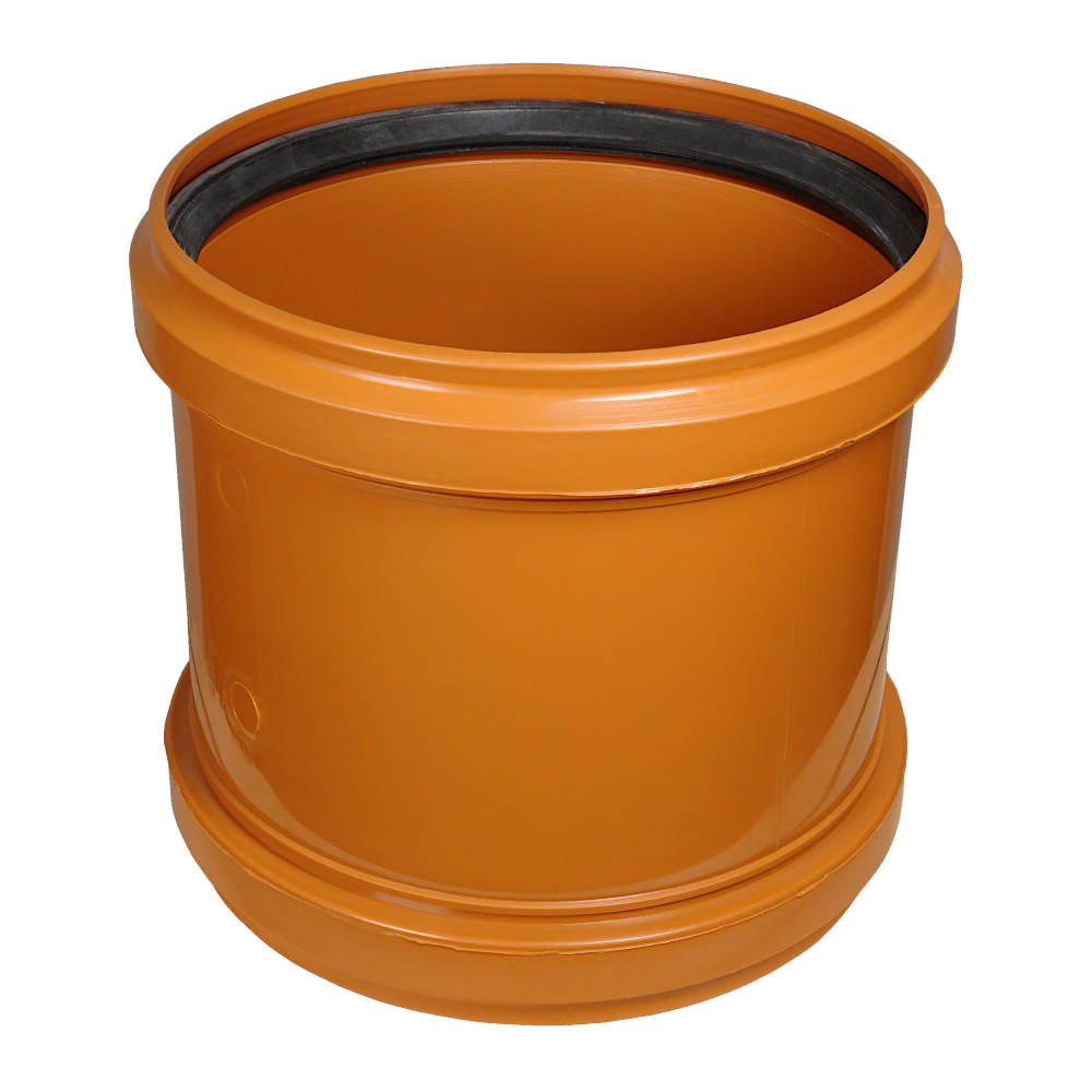 Муфта для наружной канализации предназначена для сращивания двух концов труб. Может быть использована в случае необходимости наращивания длины труб обрезками труб, не имеющими фитингов с манжетными уплотнениями